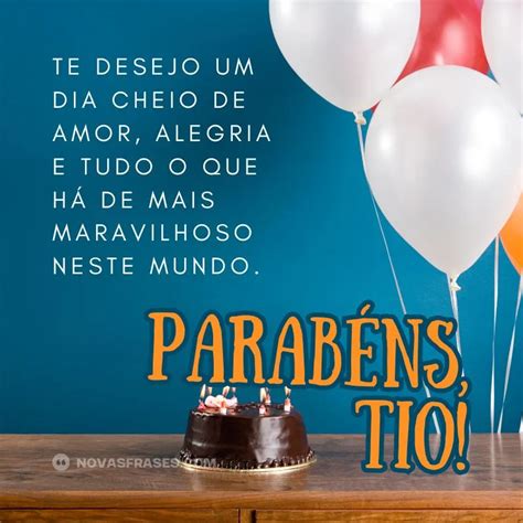 - "Querido tio, hoje é o seu dia especial, e eu não poderia deixar de desejar toda a felicidade do mundo para você. Espero que este novo ano seja repleto de novas experiências e momentos inesquecíveis. Parabéns pelo seu aniversário!"